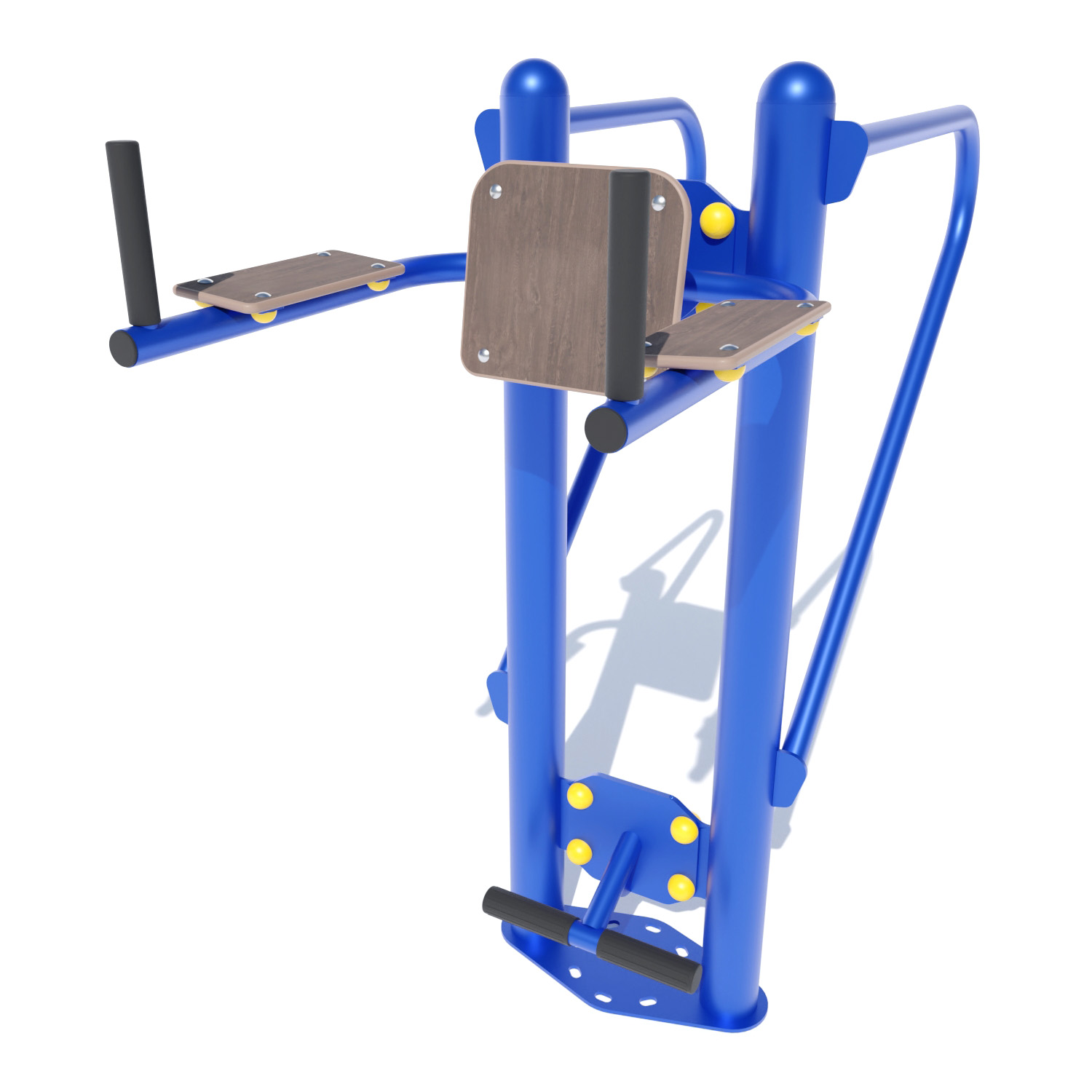 Вуличний тренажер “Упор для преса – бруси” SG173 забезпечує комплексне тренування м’язів преса, грудей, трицепс та дельтоподібних м’язів. Сприяє активному спалюванню підшкірного жиру. Тренажер з двох сторін і складається з двох елементів: Упор для преса та бруси.