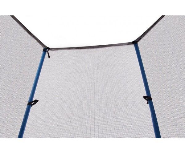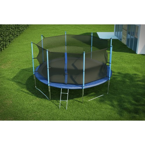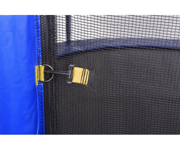 Особливість конструкції - внутрішнє розташування сітки - допомагає захистити пружини від випадкових пошкоджень і продовжити термін їх служби. Поліпропіленове стрибкове полотно відрізняється стійкістю до великих вантажів, вологості і сонячного випромінювання. Також для зручності батут оснащений хромованими сходами і захисним полотном від дощу.