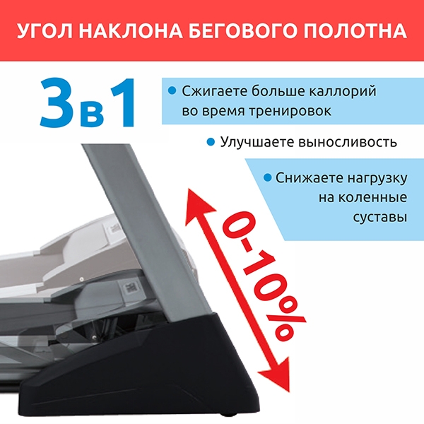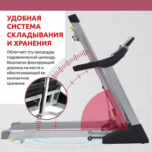 - Для высокого комфорта и безопасности установлен гидравлический цилиндр, облегчающий процедуру складывания/раскладывания дорожки. Надежная система складывания обеспечивает компактное хранение и возможность быстрого перемещения не наклоняя тяжелый тренажер, благодаря четырем опорным роликам в отличии от двух, как это обычно у других производителей;
