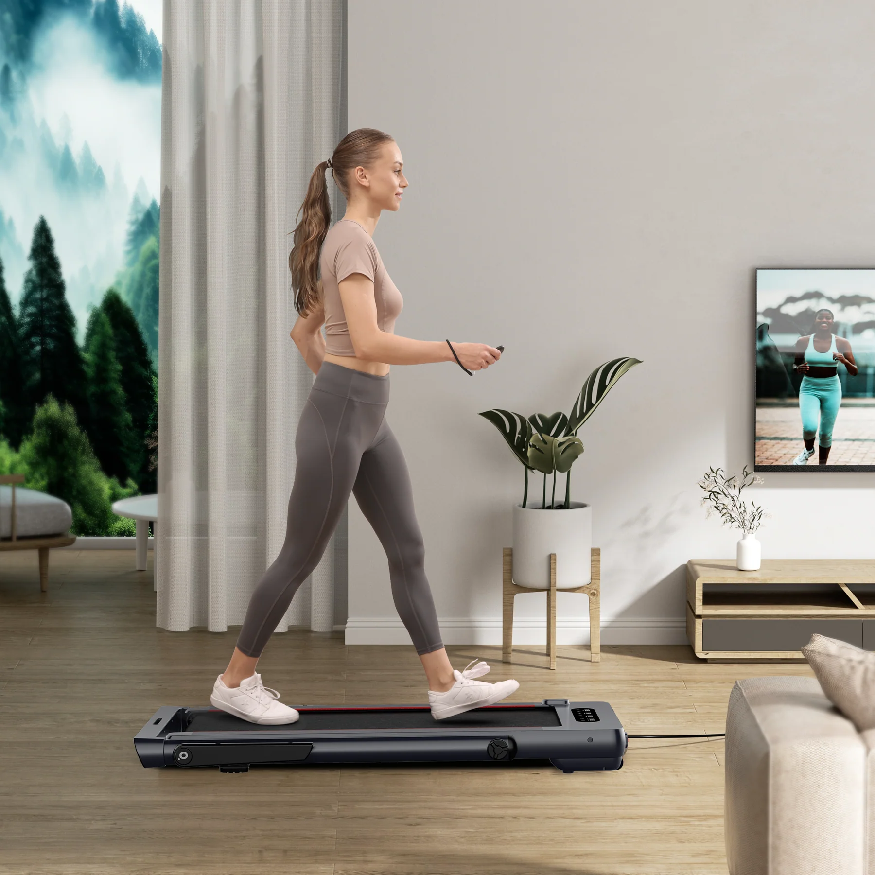 Сучасний та мінімалістичний вигляд у чорному кольорі дозволяє цій моделі органічно вписатися у будь-який домашній простір. Вбудовані коліщата полегшують транспортування, а ультратонкий формат у складеному вигляді дозволяє зберігати доріжку під ліжком, диваном чи за дверима.