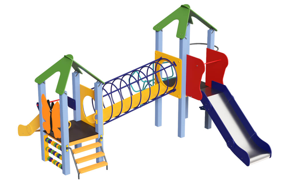 Заборчик в виде бабочки должен добавить вашей детской площадке больше яркости. А две горки – это отличное решение для економии ваших денег. Ведь теперь играть одновременно может еще больше малышей.