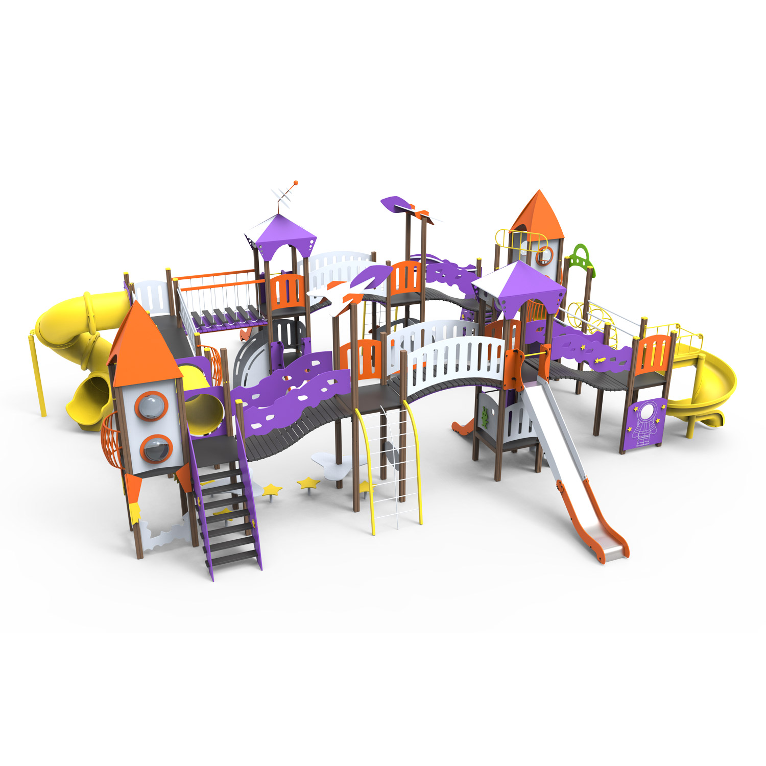 Конструкция состоит из разных платформ, горок, лесенок, соединенных между собой переходами различной конфигурации. К платформам также присоединяются спуски и подъемы. Оборудование производится исключительно из материалов высочайшего качества и надежности. Дизайн каждой детали продуман до мелочей. Элементы покрыты абсолютно безвредной для здоровья краской. Покрытие предотвращает коррозию, защищает конструкцию от выгорания, воздействия неблагоприятных погодных условий, механических повреждений. Изобретение не содержит острых углов о которые может пораниться ребенок.