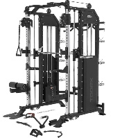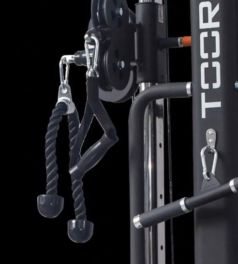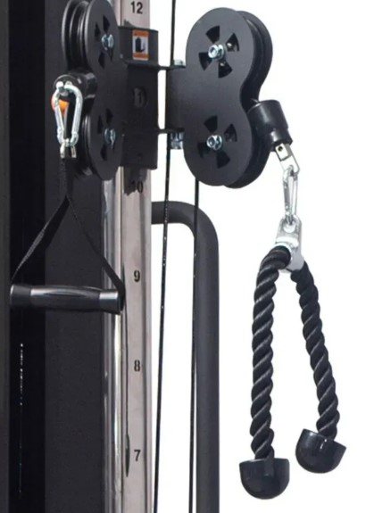 | Аксесуари в комплекті | Різноманітні рукоятки (прямі, V, канати), ремінь, тримачі для дисків і грифів, турнік, платформи для стоп, полиці для аксесуарів |