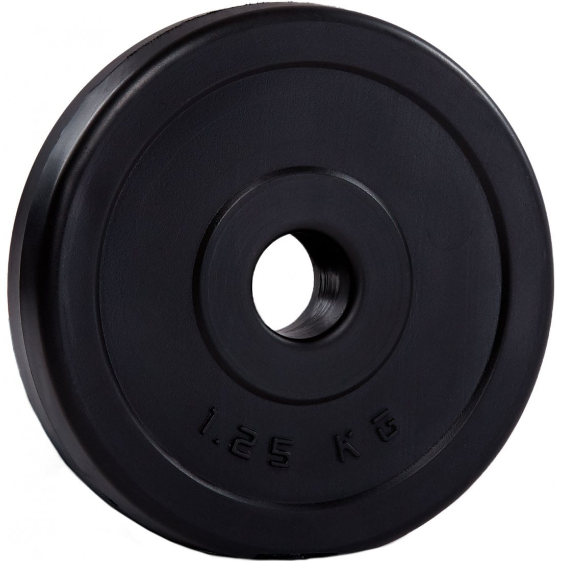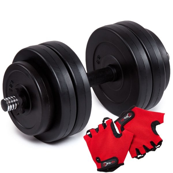Диски покриті декількома шарами пластику, який забезпечує захист підлоги, панелей, плитки при падінні гантелі. В набір входить також солідний прямий гриф з гвинтовими клемами, загальною довжиною 45 см. Ключовими елементами грифа є гвинтові закінчення і клеми, рифлені рукоятки - ці елементи покращують кожне тренування.