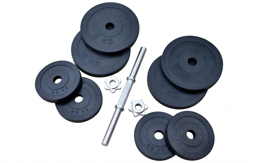 Комплектація: 4 диски по 5 кг, 4 диски по 2.5 кг, 1 гриф 42 см, 2 затискні гайки