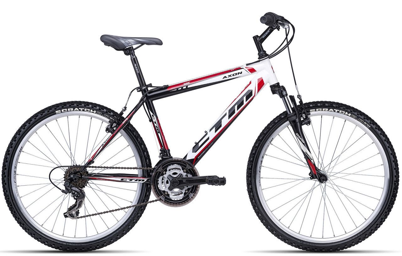 Представлений торговою маркою CTM (Словаччина) МТВ велосипед AXON призначений для активного пересування по заміських дорогах, лісових стежках і нерівним трасах, а також вільному переміщенню по міських вулицях. Значно знизити навантаження на руки і ноги, забезпечити м'якість руху і відмінний накат допомагає пружинно-эластомернаяя амортизуюча вилка Suntour M3010 і зібрані на базі 26" ободів колеса. Встановити необхідну швидкість (всього 16) допомагає система перемикання передач класу від Shimano Tourney. При натисканні гальмівних ручок миттєво спрацьовують гальма. Сталеву раму гірського велосипеда AXON можна придбати в різних розмірах (15",17",19").
