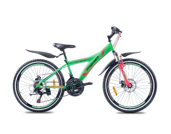 Premier Explorer24 Disc 13" SP0000341 - це комбінація універсальних характеристик, що роблять дану модель оптимальної для використання підлітками 8-12 років. Насамперед вдала конструкція сталевої рами, виконана в зелено-червоному неоновому кольорі, забезпечує комфортну їзду для дівчаток і хлопчиків з зростом до 145 см, стійко витримуючи всі навантаження, яким може піддаватися гірський велосипед класу хардтейл. Оснастивши даний велосипед Shimano-трансмісією з 21 позицією швидкості, виробник подбав про те, щоб райдер відчував себе комфортно на будь-яких ділянках дороги з різним ухилом. Простота перемикання передач і своєчасне гальмування стали можливими з наявністю високоефективних комплектуючих - переключатей Shimano і Saiguan, манеток Shimano SL-RS35 і дискових механічних гальм.