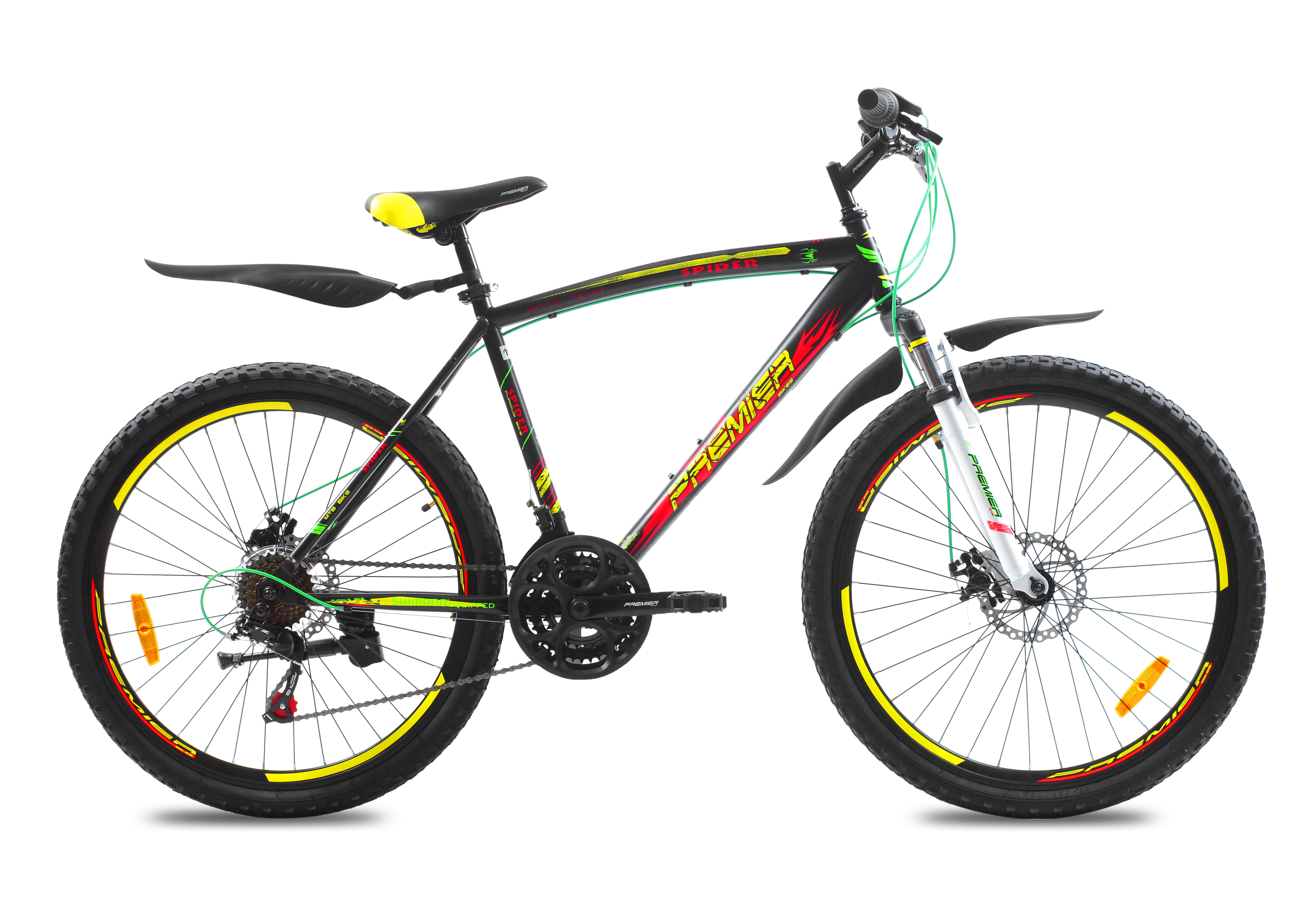 Велосипед Premier Spider 26 Disc 19" SP0001476 matt black - чудова позашляхова модель гірського типу, завдяки практичної геометрії сталевої рами розміром 19 ідеально підходить для чоловічої аудиторії. Конструкція обладнана здвоєними обіддям, виконаними з алюмінію, комфортною амортизаційної Premier-вилкою, що усуває дискомфорт при їзді під час трясіння і руху по горбистій поверхні доріг. Оснастивши даний велосипед якісної трансмісією початкового рівня, що дозволяє легко і плавно перемикати передачі на 21 швидкість, конструктори подбали про надання користувачам широкого кола всього необхідного для безпечного і приємного катання, у зв'язку з чим слід також відзначити наявність в комплектації надійних дискових гальм від Jak, ручок перемикання Shimano SL-RS35 і перемикачів Shimano і Saiguan, касети на 7 швидкостей і зручного сидіння від Premier. Вага конструкції - 19 кг. Виконується в солідному матово-чорному кольорі.
