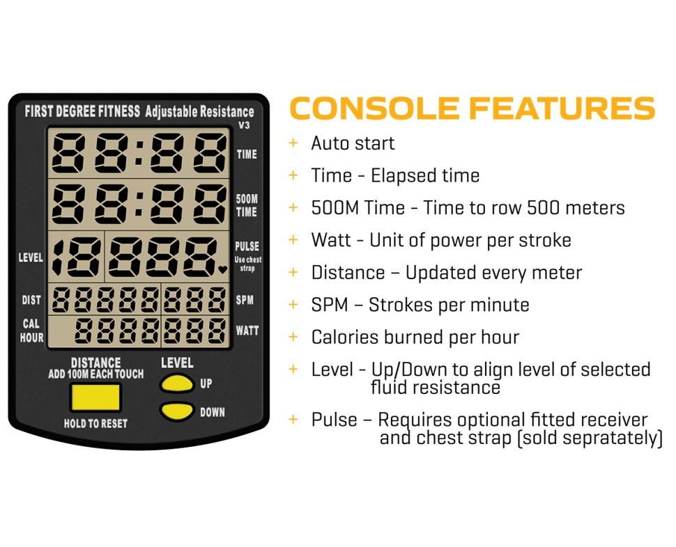 - Контролює: загальний час, дистанцію, час на 500 м, кількість гребків, частоту серцевих скорочень, навантаження у ватах та калорії.