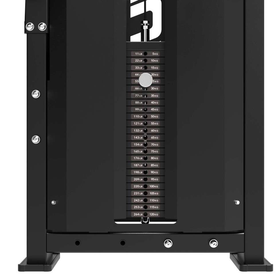 Ваговий стек до 120 кг з можливістю регулювання з кроком 2,5 кг забезпечує контрольовану та точну прогресію, що ідеально підходить для будь-якого рівня користувачів.