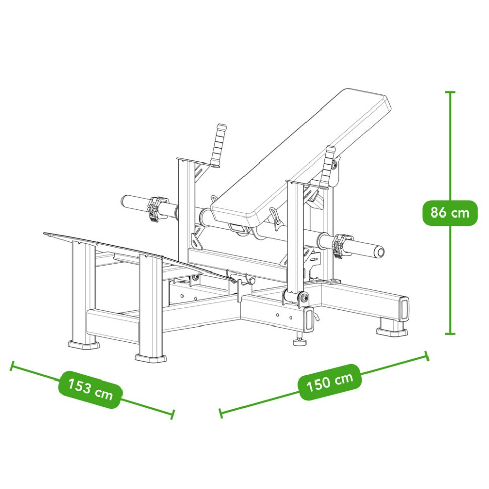Тренажер на вільних вагах (диски 50 мм) підтримує навантаження до 150 кг на штифт. Це дає необмежену можливість прогресу в силі, імітуючи природний рух.