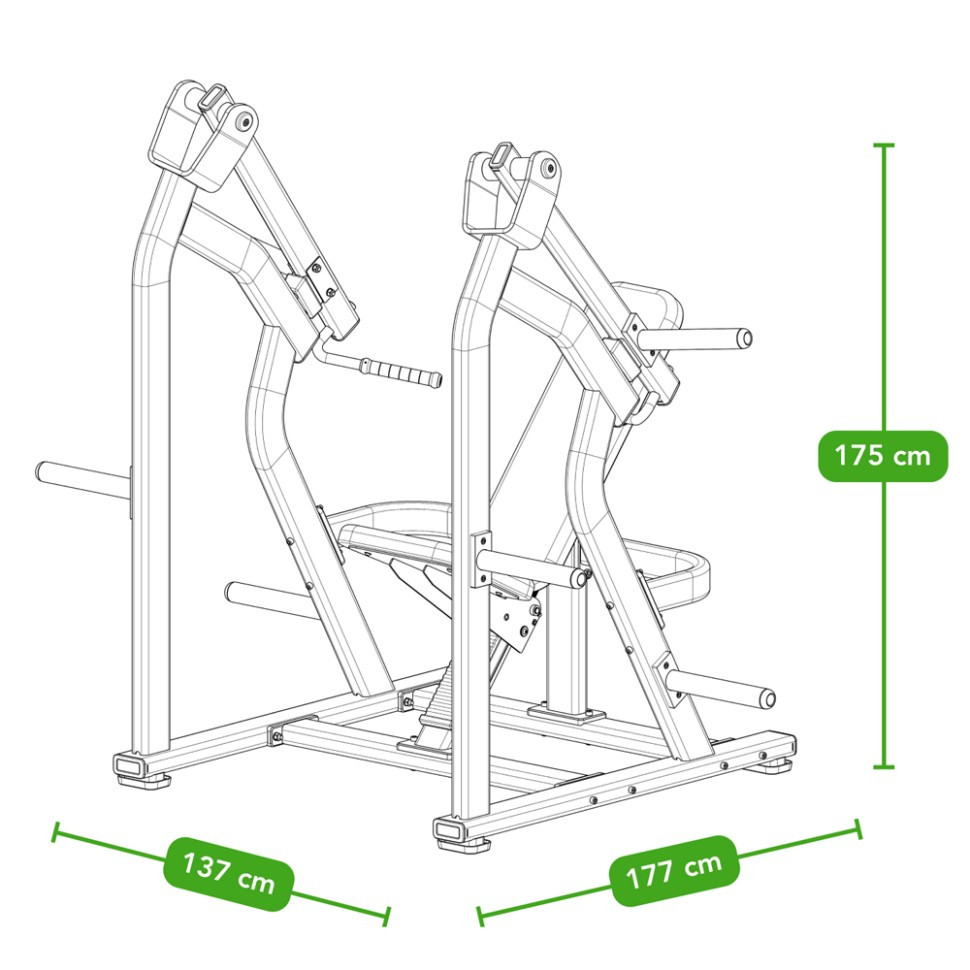 Тренажер підтримує олімпійські диски 50 мм, дозволяючи навантажувати до 150 кг на кожен штифт. Опір на пластині сприяє максимальному збільшенню реальної сили.