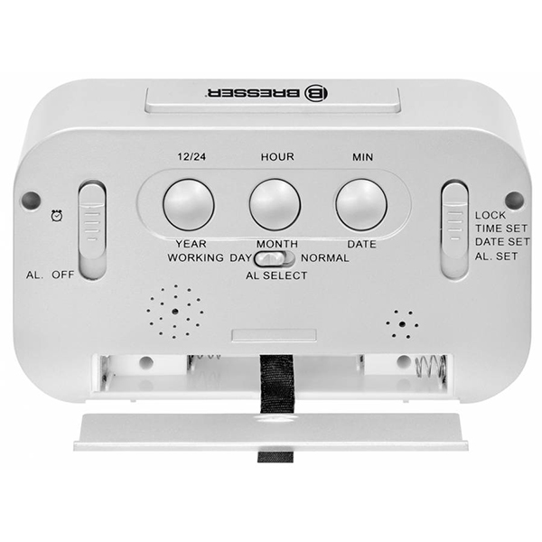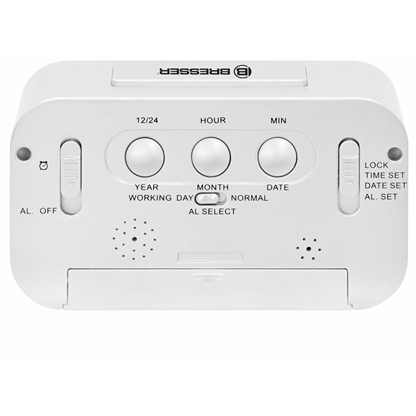 Модель отображает на дисплеи внутреннюю температуру и относительную влажность в помещении, часы с функцией двух независимы будильников.