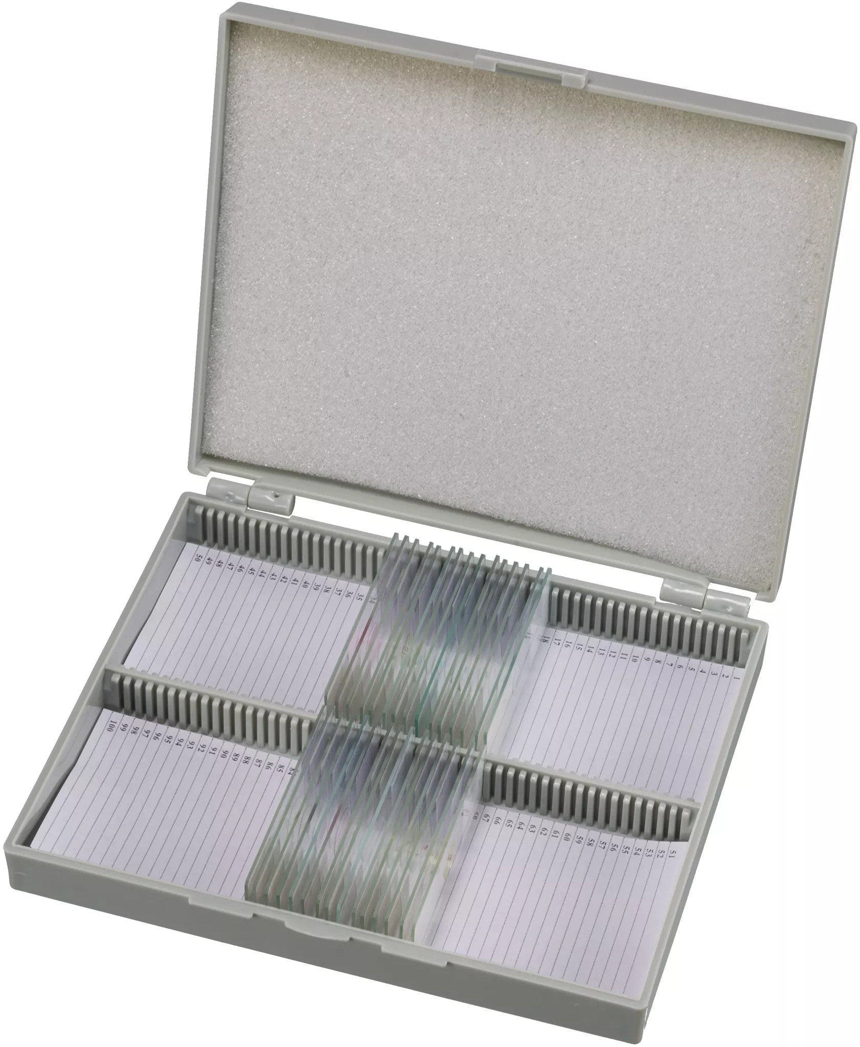 Усі слайди надійно закріплені в компактному футлярі з описом і маркуванням англійською та німецькою мовами. Легко транспортується та захищає препарати від пилу і пошкоджень.