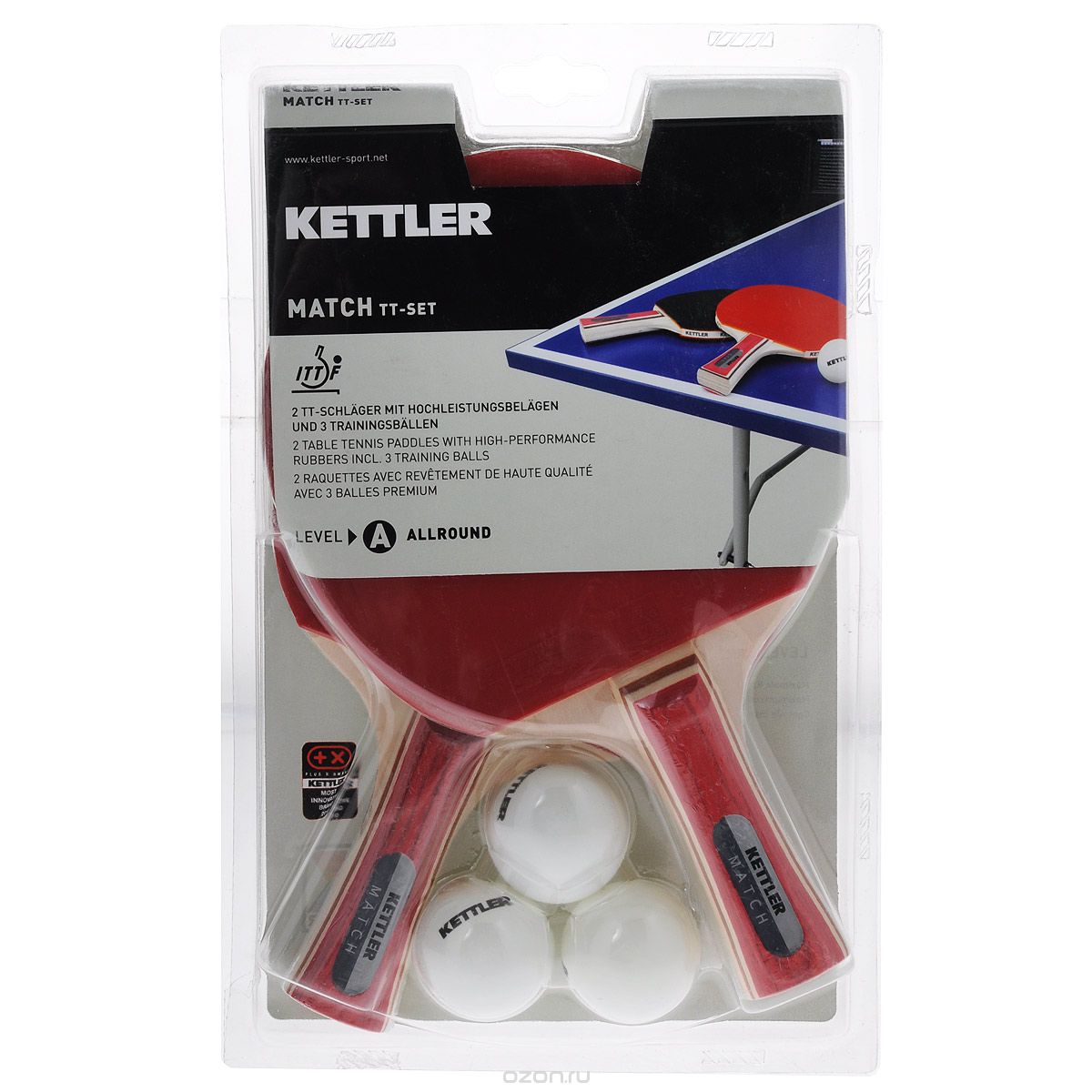 Набір ракеток і м'ячів для гри у настільний теніс Kettler Match 7091-500 включає в себе 2 всепогодні ракетки і 3 м'ячики. Ракетки мають п'ятишаровим підставою, і високоякісними гумовими накладками 1,5 міліметрової товщини. Анатомічна і ергономічна ручка дозволяє легко та віртуозно володіти ракеткою, яка зручно лежить в долоні. Набір відноситься до класу А. Підходить для гравців будь-якого рівня. Швидкість 5, обертання 4, контроль 9.