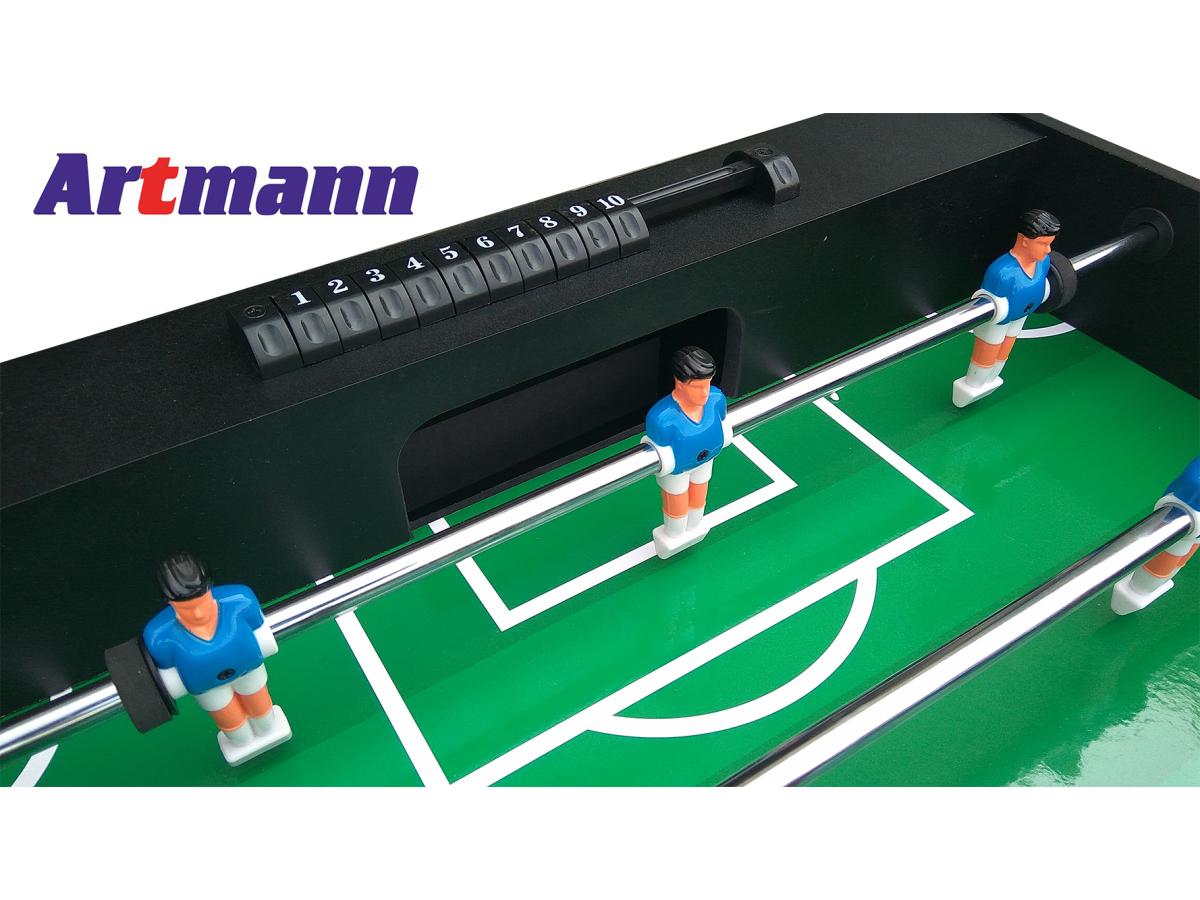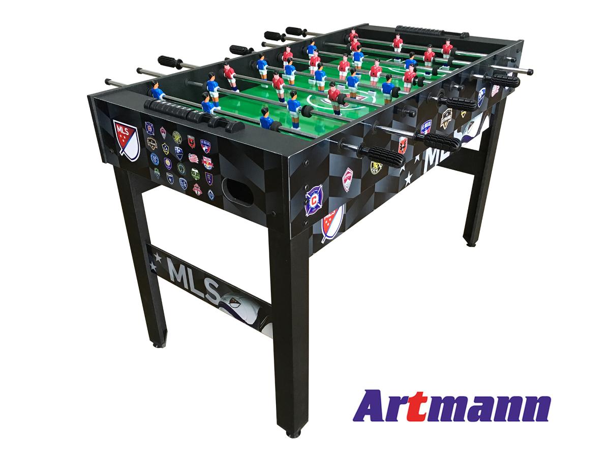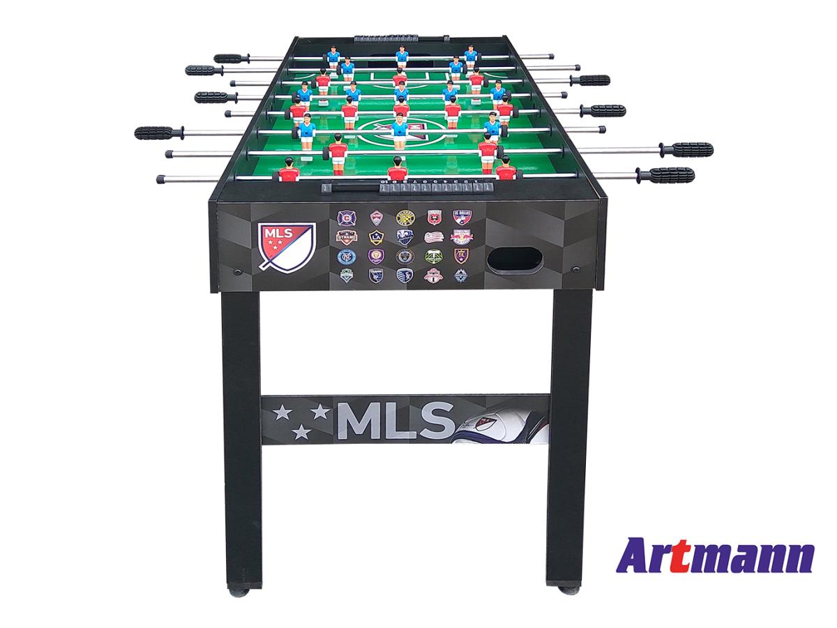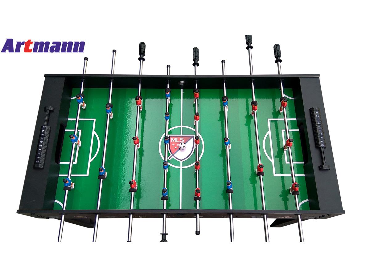 Artmann MLS - це вражаюча комплектація, в якій є лічильники, запасні фігурки гравців і м'ячики, таким чином, відразу після покупки і установки на повну насолодитися грою. За міцність настільного футболу відповідає основа у вигляді високонадійного МДФ матеріалу, який також прикрашений якісної графікою. Захоплююча і азартна, ця настільна гра зможе на довгий час захопити і утримувати увагу користувачів, тому рекомендована як в розважальних цілях, так і задля підвищення координації та швидкість реакції. Буде чудово виглядати на терасі заміського будинку, в гаражі, офісі або спортивному куточку. Виріб виконано з загальними габаритами 127х67х15 см і розмірами поля 121х61х79 див. Власна маса всієї конструкції становить 24 кг.