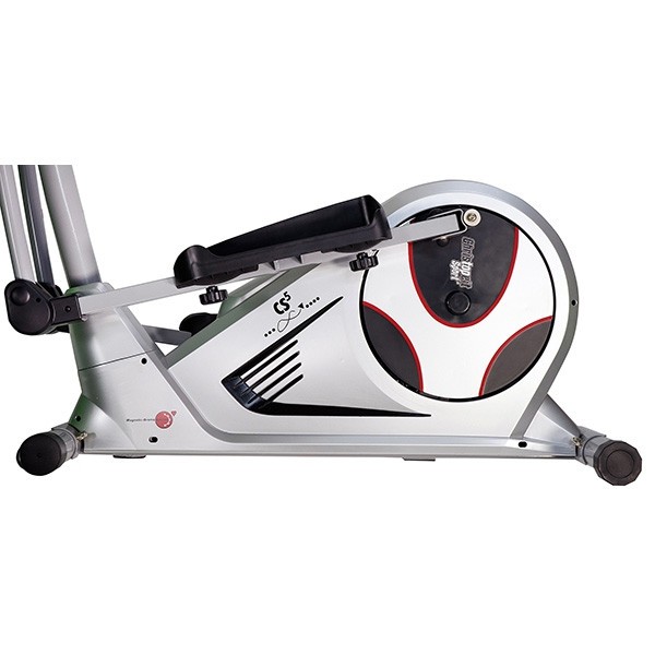 Еліптичний магнітний тренажер Christopeit sport CS5 99254 надійний, витривалий, ергономічний, поєднуючи в собі найкращі риси попередніх модифікацій, пропонуючи практично безшумну роботу механізмів конструкції і комфортну експлуатацію завдяки виконанню в приємному дизайні і оснащення набором найбільш актуальних функцій для ефективної домашньої тренування. Може похвалитися можливістю автономної роботи від двох батарейок, легким в управлінні міні-комп'ютером, що відображає на монохромному читабельному екрані значення часу, дистанції, пульсу і приблизного витрати калорій, а також передбаченими приємними нюансами у вигляді компенсатори нерівності, зручних нековзних педалей-платформ з регулюванням на три ступені, і транспортувальних роликів, гарантуючи безпеку й високий контроль у процесі щоденних спортзанятий. Дана модель включає наступні технічні характеристики: масу 40 кг, розміри 140х59х171 см, допустиме навантаження вагою користувача до 150 кг, магнітну систему опору на 8 рівнів складності і 8-кг махове колесо.