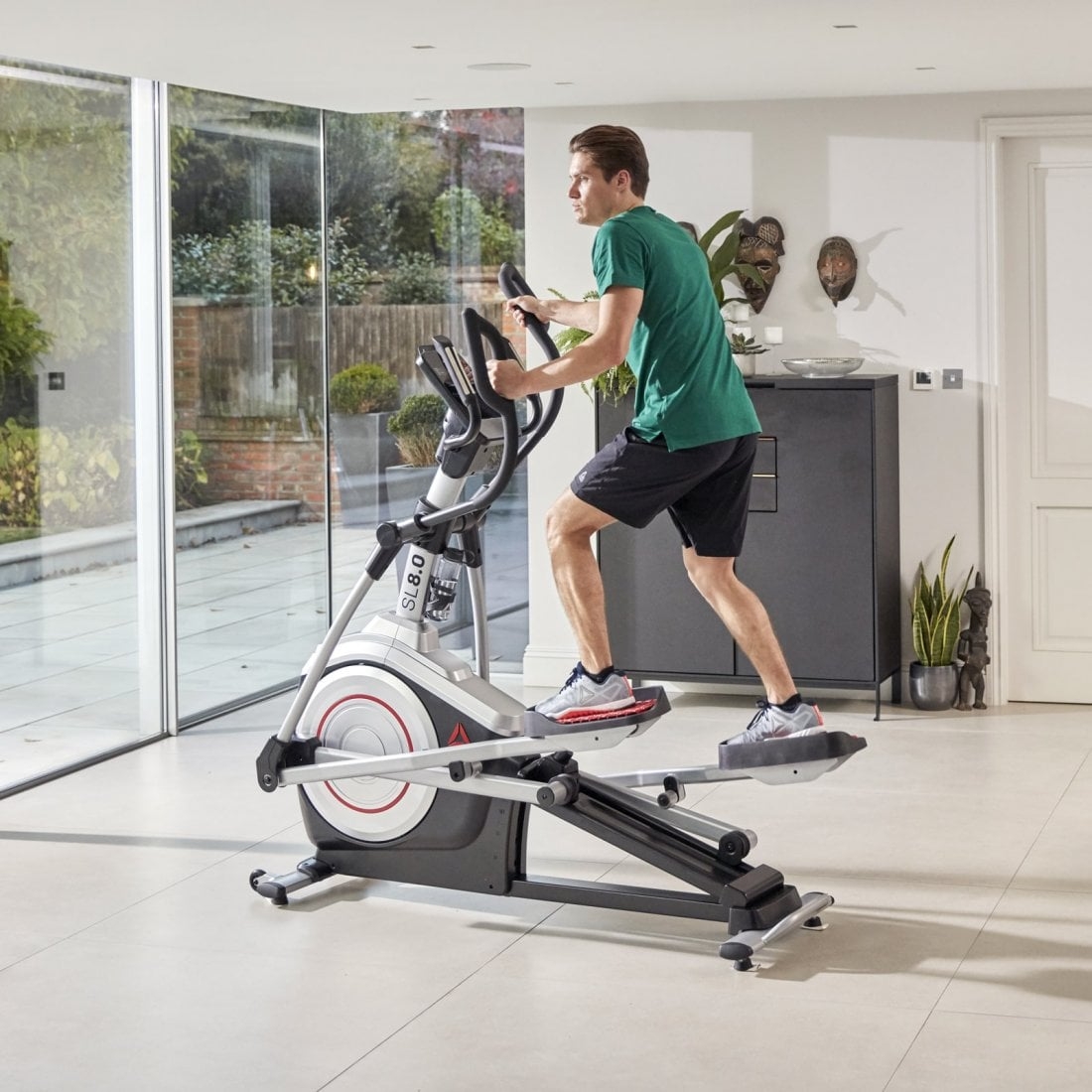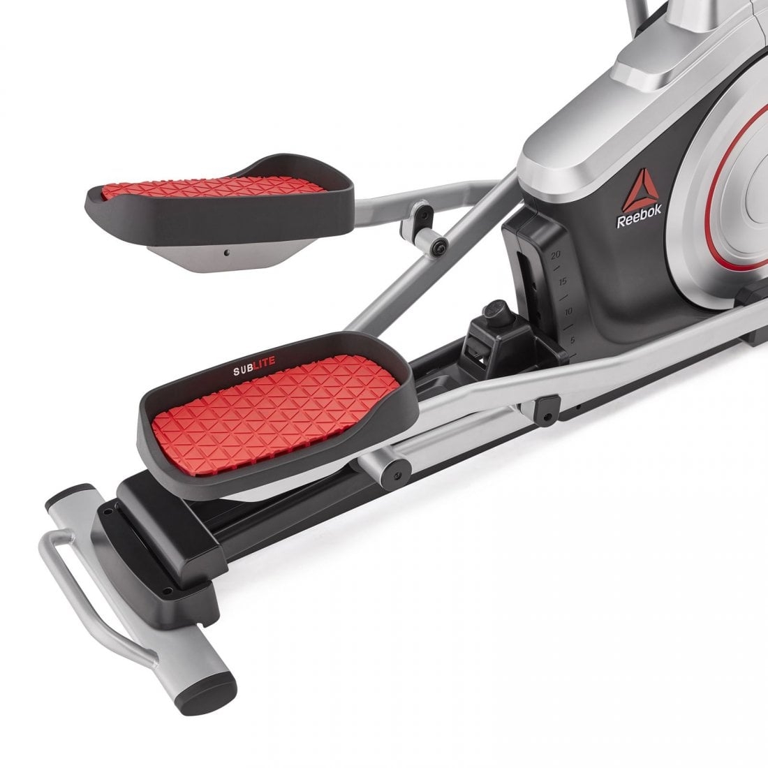 Новинка 2020 года - переднеприводный орбитрек Reebok SL8.0 RVSL-10811 с электромагнитной нагрузкой и возможностью регулировки угла наклона педалей. Данная модель рассчитана на пользователей с массой тела до 135 кг. Система нагружения состоит из встроенного электромагнита и массивного махового колеса, массой в 9 кг, способного выдавать инерционную массу нагрузки, эквивалентную 20-24 кг. Так же стоит отметить практически полную бесшумность при работе. Ещё немаловажной особенность тренажера является возможность регулировки угла наклона педалей в диапазоне от 0 до 20%. Изменение угла наклона позволяет увеличить количество задействованных мышц при выполнении упражнений. Платформы-педали имеют довольно большую площадь и покрыты специальными, антискользящими проставками с амортизирующим эффектом.