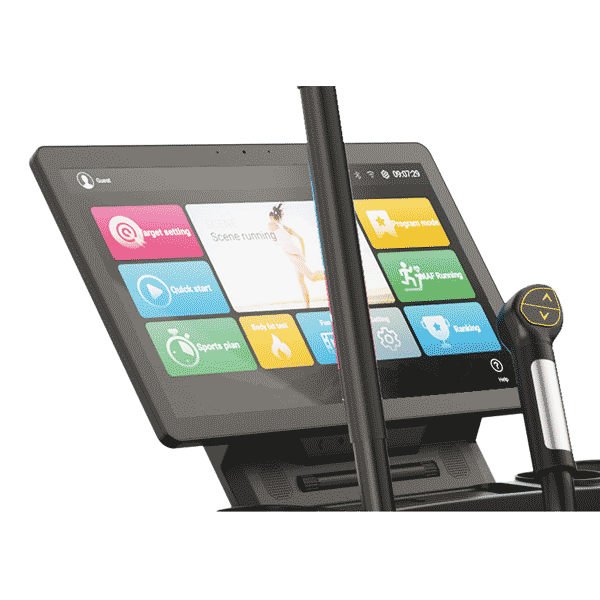✅ Сенсорний TFT-дисплей — відображає всі ключові параметри тренування: час, дистанцію, швидкість, калорії, пульс, рівень опору, а також інтерактивні віртуальні ландшафти.
