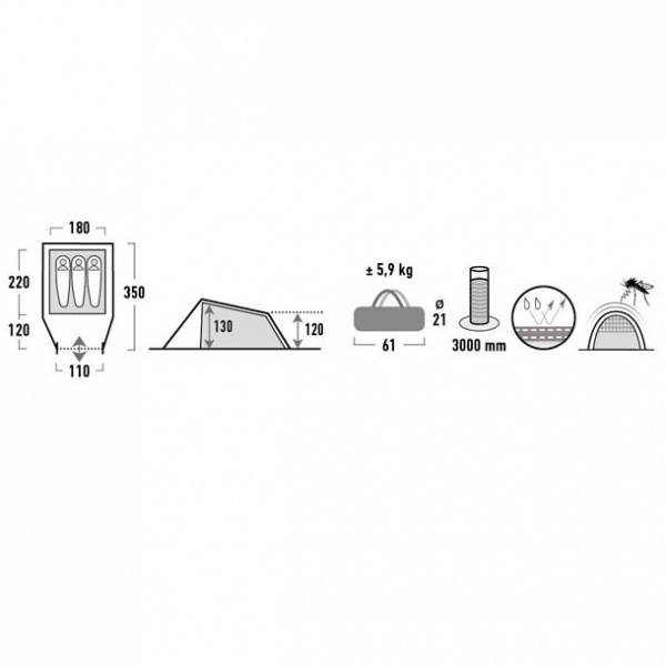 Хорошо продуманная эффективная система вентиляции обеспечивает отличную циркуляцию и непрерывный приток свежего воздуха. 2-х слойная конфигурация предлагает наличие наружного тента из 190Т полиэстера с полиуретановым водостойким покрытием, выдерживающим до 3000 мм осадков, и внутреннего слоя из дышащего полиэстера, при этом оба слоя и полиэтиленовое дно снабжены проклеенными швами. У входа во внутреннюю палатку предусмотрен защитный борт от грязи. В сложенном для транспортировки виде палатка обладает диаметром 21 см и длинной 61 см.