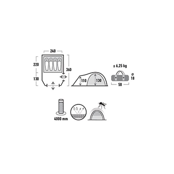 Оборудование системой Vario Vent Kontrol гарантированно обеспечит эффективную циркуляцию воздуха и создаст приятный микроклимат для обитателей палатки. Вплетение светоотражающей нити в натяжные шнуры и светоотражающая лента по периметру палатки предназначены для облегчения ориентации на местности в темноте. Предложенная модель весит 6,25 кг и в сложенном варианте обладает диаметром 18 см и длинной 58 см.