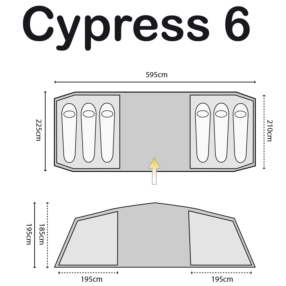 Огнестойкий и устойчивый к влаге наружный тент изготовлен из 190Т полиэстера с полиуретановым покрытием, рассчитанным на выпадение до 3000 мм осадков, что позволит эффективно защитить обитателей палатки от дождя. Все швы тента и днища (полиэтилен) надежно проклеены, гарантируя необходимую герметичность. Вместе с палаткой также приходит компрессионная сумка, с помощью которой изделие легко складывается до компактных размеров 60х25х23 см, облегчающих транспортировку экипировки. Модель Cypress 6 Teal 927931 весит 11 кг и имеет внешние габариты 595х225х195 см, а внутренняя палатка создана с размерами 210х195х185 см.