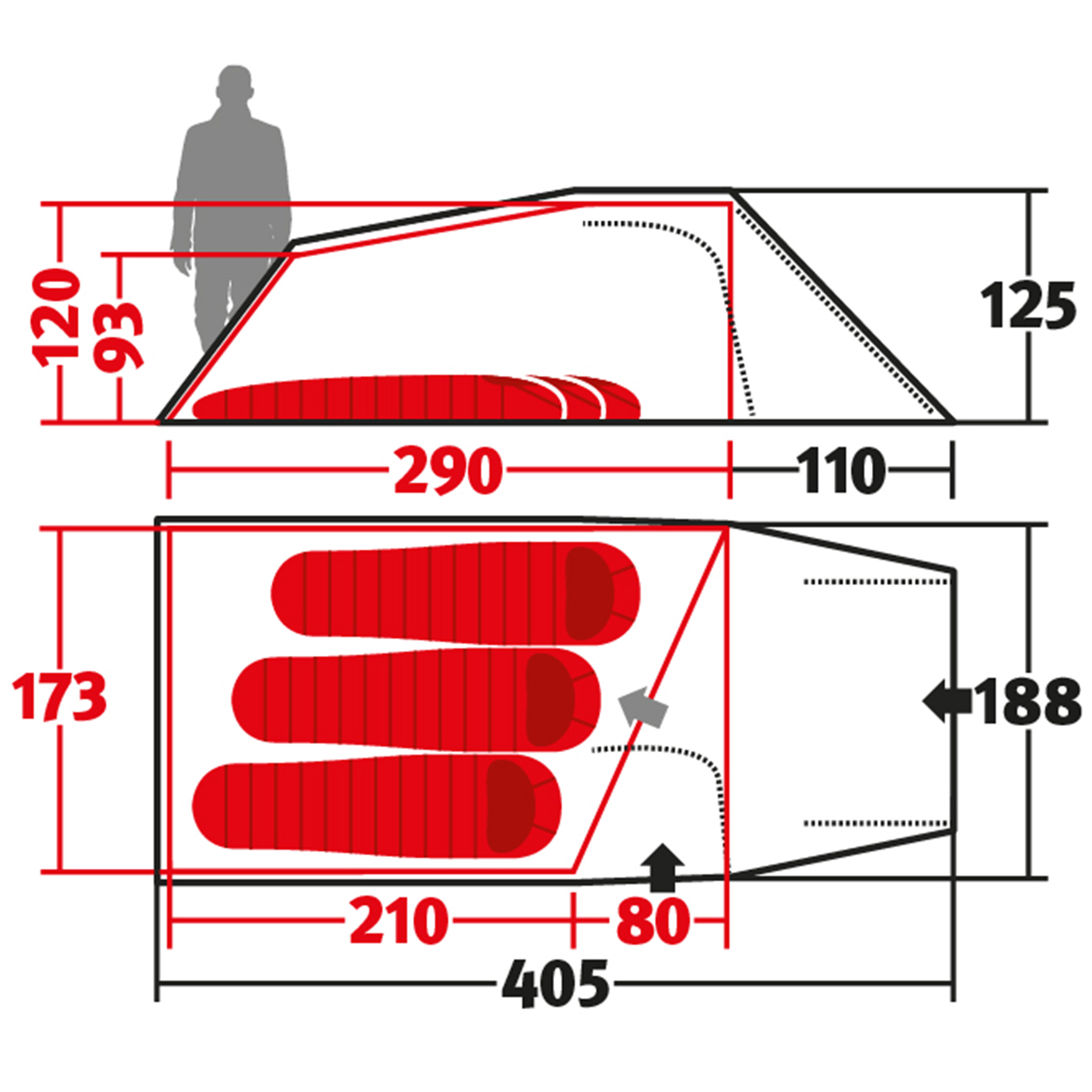 - Зовнішній намет (Д х Ш х В): 405 х 188 х 125 см
