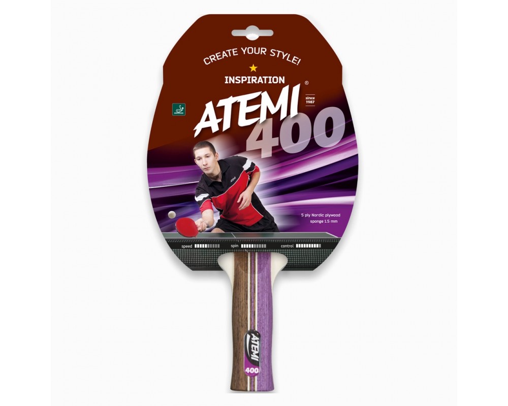 Ракетка ATEMI 400 А для спортсменов любителей. Комбинация скорости, вращения и контроля резиновой накладки Challenge (ITTF), позволяет использовать эту ракетку для различных стилей игры.