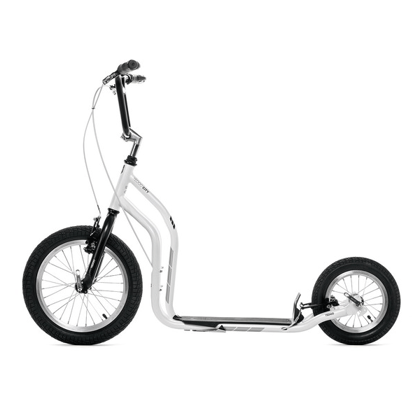 Самокат Yedoo City New White/Black - це міцна маневрена конструкція з яскравим і стильним дизайном, соковиті кольори якої забезпечуються зносостійкої порошковим фарбуванням, якою покрита рама з високотехнологічної сталі з високим запасом міцності й оригінальною геометрією, вивірені форми якої роблять самокат не тільки більш керованим, але і легким у транспортуванні і зберіганні. Технічні вузли також мають підвищений рівень надійності, адже пропонують литі втулки з функцією Quick Release і підшипники промислового якості, що безумовно підвищує термін служби. Необхідно також відзначити легкість гальмування завдяки ручним важелів і завжди вчасно спрацьовує і ефективної системи подвійних V-Tektro литих гальм.
