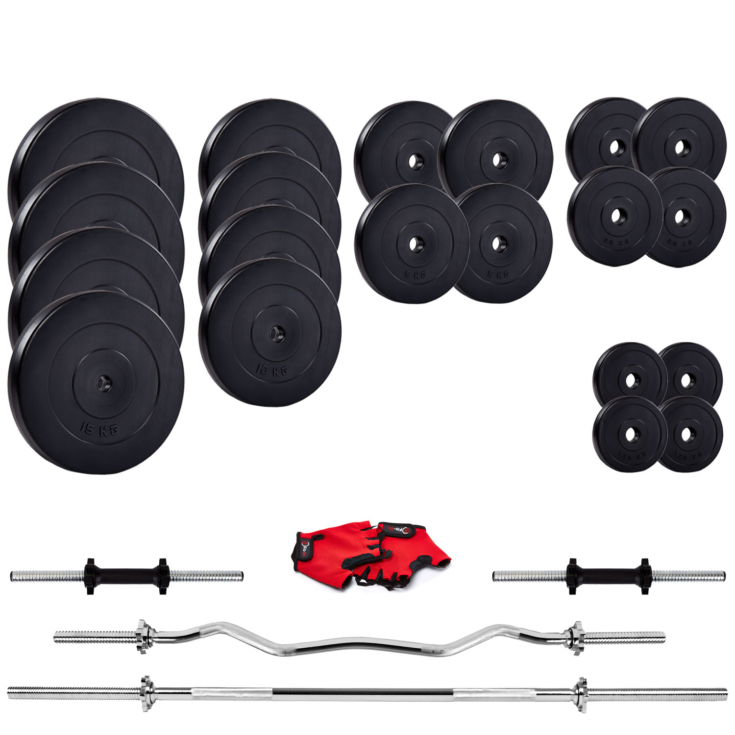 В комплект входит гриф прямой длиной 180 см с диаметром 30 мм, гриф W-образный, перчатки и диски. Общий вес составляет 155 кг.
