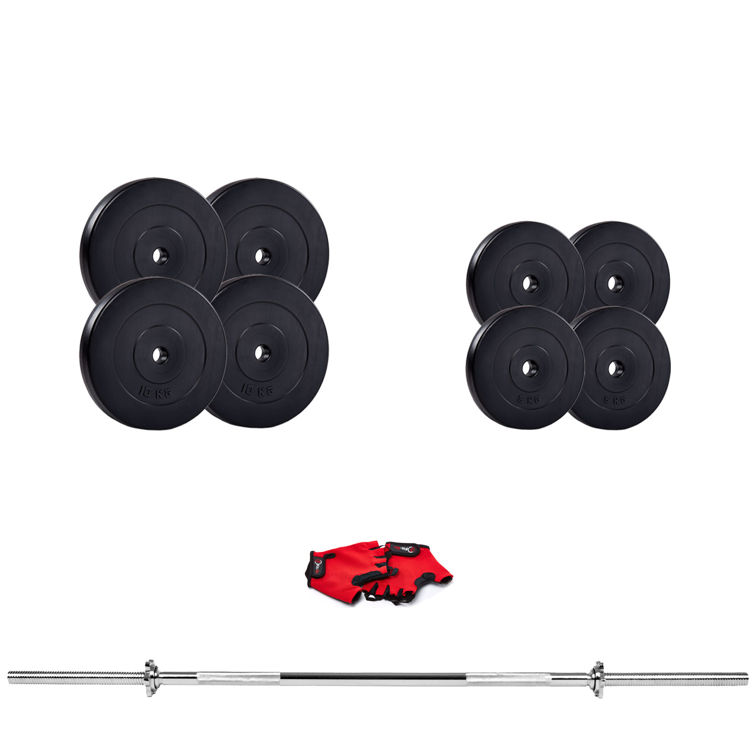 В комплект входит гриф прямой длиной 180 см с диаметром 30 мм, перчатки и диски. Общий вес составляет 70 кг.