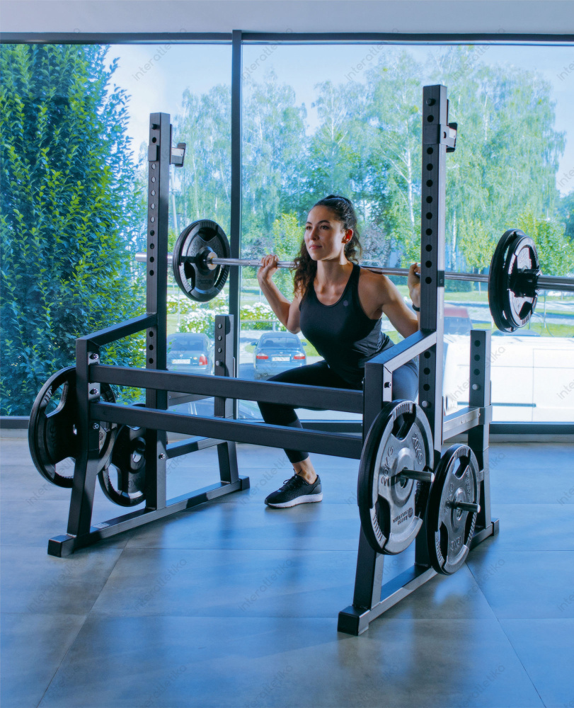 Ідеальна висота для зручного зняття штанги при присіданнях, випадах або жимі.