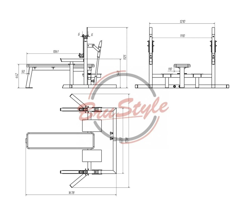 Скам’я BruStyle ТС-703 виготовлена з урахуванням усіх стандартів професійного пауерліфтингу: дотримано габарити сидіння, висоту та ширину стійок, правильну проєкцію грифа та розміри конструкції. Модель призначена для виконання двох основних силових вправ — жиму лежачи та присідань, забезпечуючи максимальну стійкість і безпечність під час роботи з великими вагами.