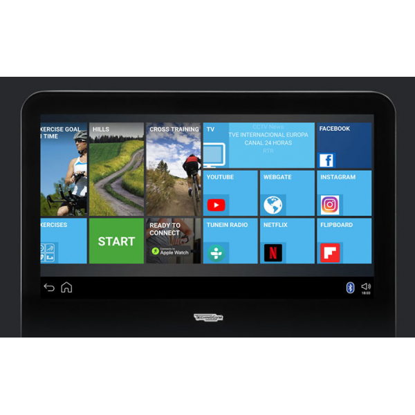 Тренажер оснащён самой современной консолью Unity™ с сенсорным Full HD экраном 15". Консоль с очень быстрым процессором работает на базе Android 9.Х, оснащена видеокамерой. В систему можно войти с любого устройства Android (4.3 и выше) и iOS (8.0 и выше) через Bluetooth или Wi- Fi.